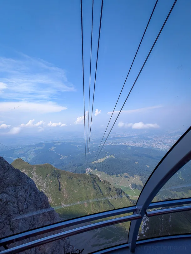 Nach dem Gipfelabenteuer geht es schwebend mit der modernen Luftseilbahn «Dragon Ride» hinunter nach Fräkmüntegg. Schon der Einstieg fühlt sich ein bisschen wie in ein Helikopter-Cockpit an – riesige Fenster geben das Gefühl, über den Bergen zu schweben.